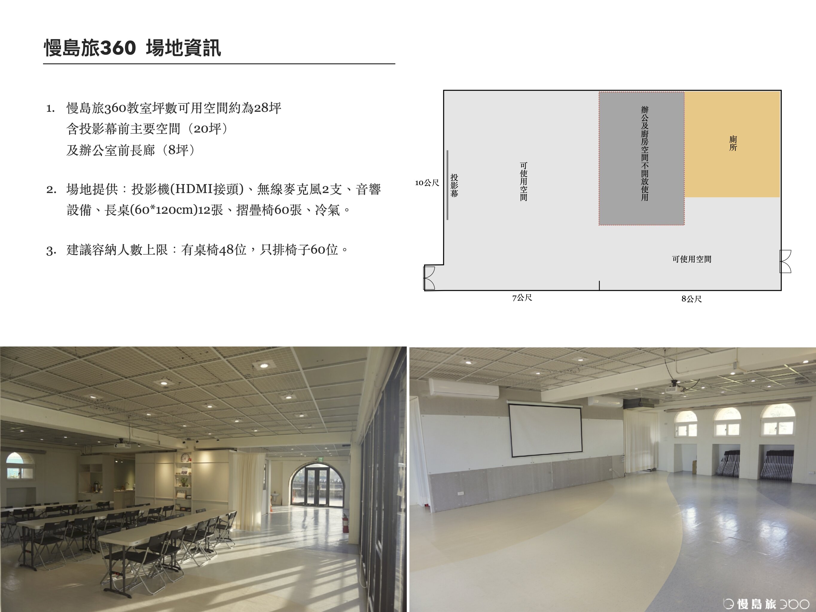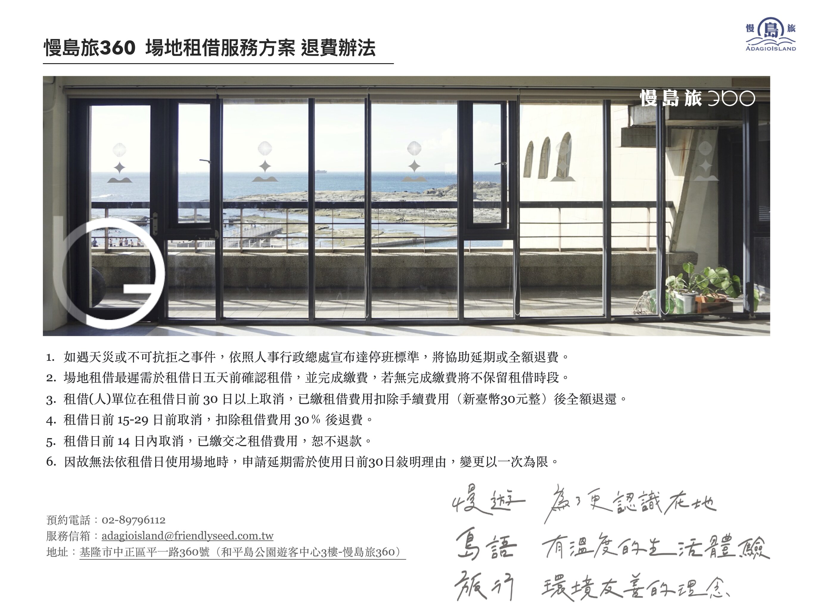 # 預約請先來電確認~預約電話:02-89796112 徐小姐服務信箱:adagioisland@friendlyseed.com.tw地址:基隆市中正區平一路360號(和平島公園遊客中心三樓-慢島旅360空間)